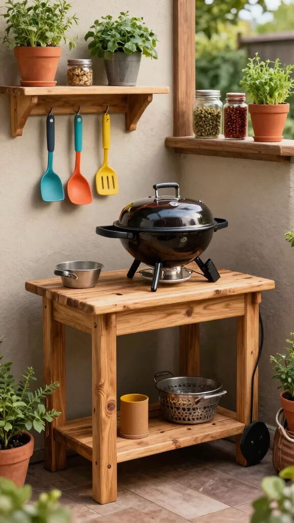 Do you want to enjoy grilling right from a cozy corner of your patio? A compact grill and prep station can make your outdoor cooking experience both convenient and fun. With a cart-style grill, you can easily move your cooking setup wherever the action is happening. Pair it with a rustic prep table made from reclaimed wood to keep your essentials organized and within reach, while also adding charm to your space. Plus, a grill with a side burner lets you whip up sides or sauces simultaneously, making cooking a breeze.