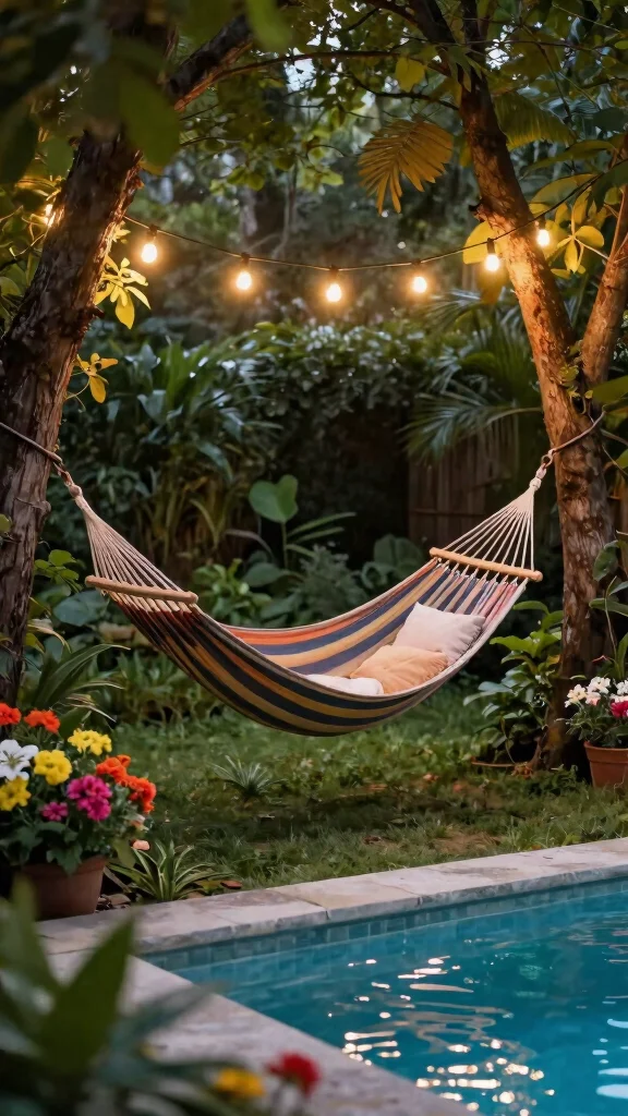 Position hammocks near the pool or under trees for natural shade, creating a soothing atmosphere. Choose from a variety of styles, from traditional woven hammocks to modern fabric designs, to ensure they blend beautifully with your outdoor decor.