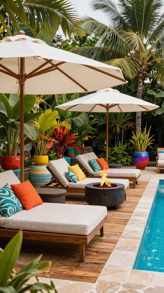 Design your lounging area using natural materials like wood and fabric to reflect comfort. Surrounding greenery can create a tropical vibe, while a fire pit extends the use of the space into cooler evenings, making it truly multifunctional.