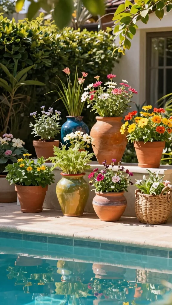 Imagine vibrant flowers and fresh herbs right at your poolside, adding color and life to your space. Container gardening offers a flexible way to enhance your outdoor area without permanent changes. Choose a mix of pots in various materials like terracotta or ceramic, and fill them with bright blooms and tasty herbs like basil and cherry tomatoes. This not only beautifies your patio but also allows you to easily rearrange as your needs change.