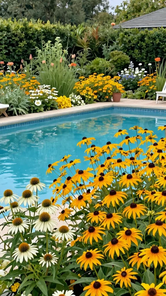 – Design winding pathways using wildflowers to connect the pool to seating areas.