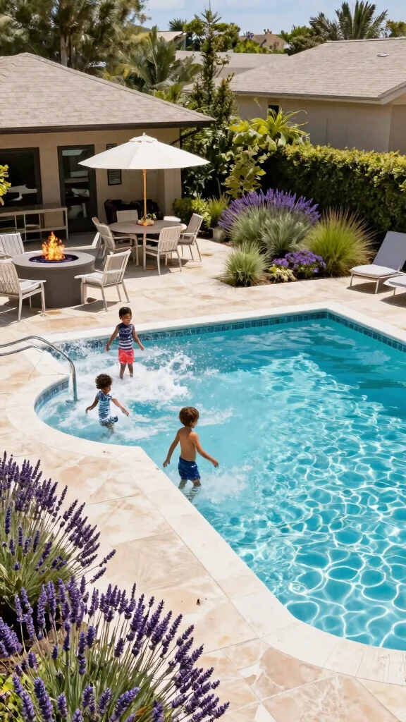 Craft a multi-functional pool area that seamlessly blends relaxation and recreation. This design incorporates features like a splash zone for kids, sunken seating, and native landscaping to maximize versatility.