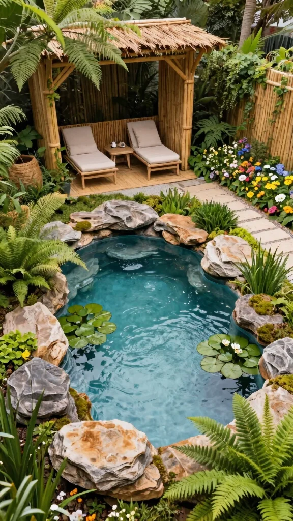 Incorporate smooth stones, sand, and native plants like bamboo and sedges to evoke a calming atmosphere. A small rock waterfall flowing into the pool adds soothing sounds, enhancing the peaceful environment.