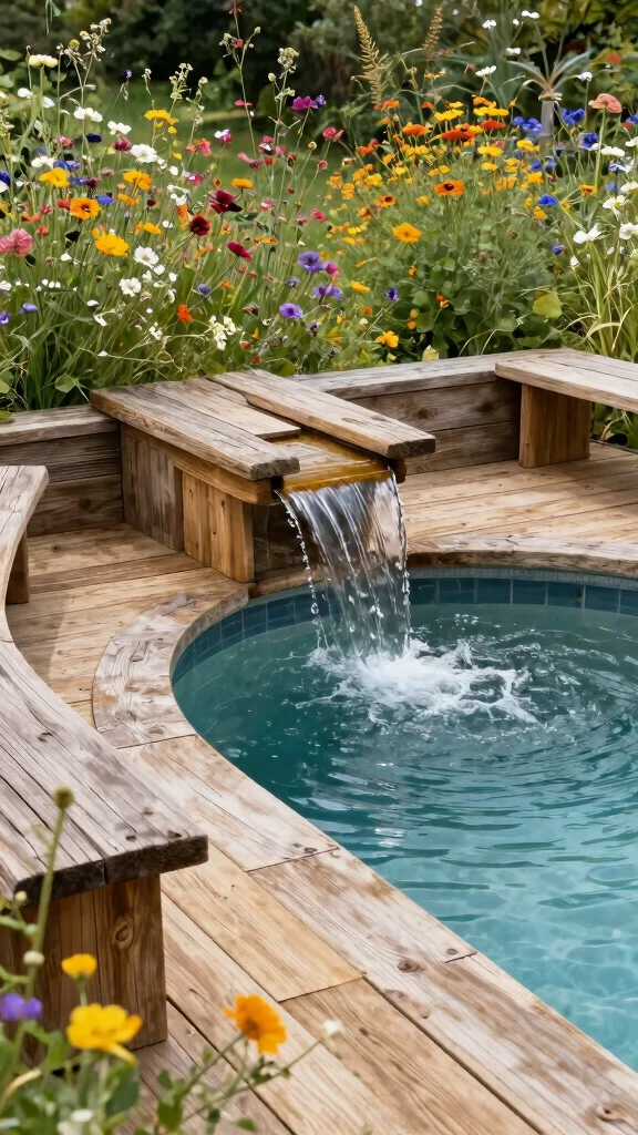 Use reclaimed wood for decking and structures, paired with a gentle waterfall cascading into the pool. Surround the pathways with native wildflowers to enhance the natural beauty and attract beneficial insects.