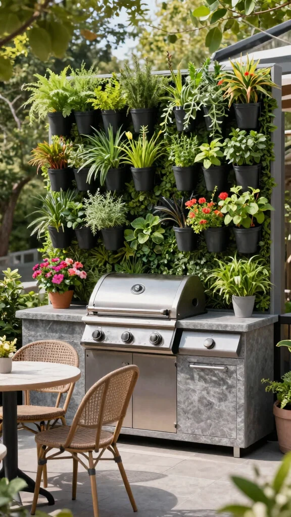 Imagine grilling while surrounded by fresh herbs and vibrant veggies. A vertical garden grill station is perfect for small spaces, combining your cooking setup with a lush green backdrop. You can easily reach for basil, thyme, or cherry tomatoes right from your grill, making every dish pop with flavor.