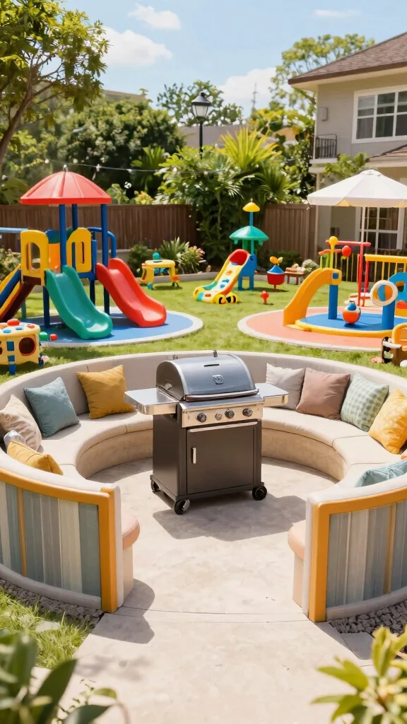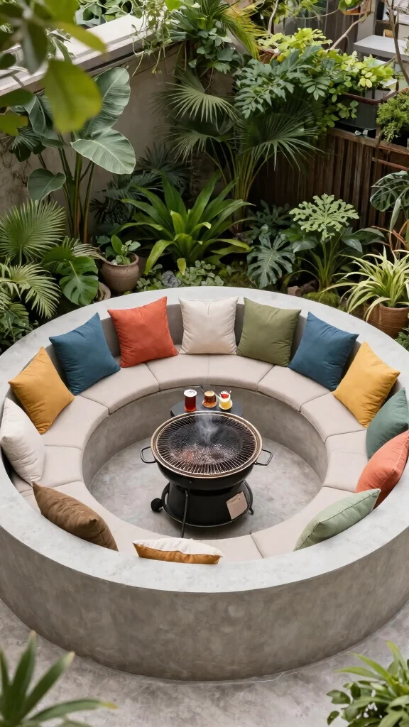 A compact circular BBQ setup is perfect for small patios and creates a cozy atmosphere for close-knit gatherings. Arranging seating in a circle around the grill encourages conversation and interaction.