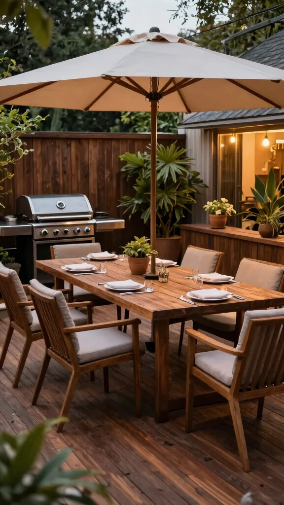Enhance your outdoor experience with a dining deck that includes a grill, creating a seamless extension of your indoor dining space. A wooden deck paired with comfortable furniture invites year-round outdoor eating.