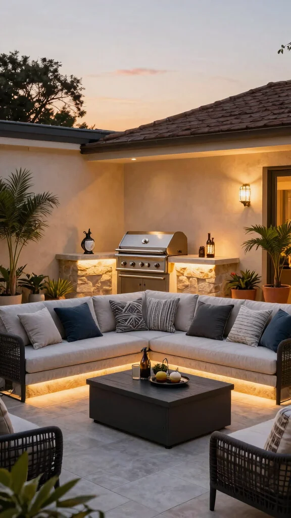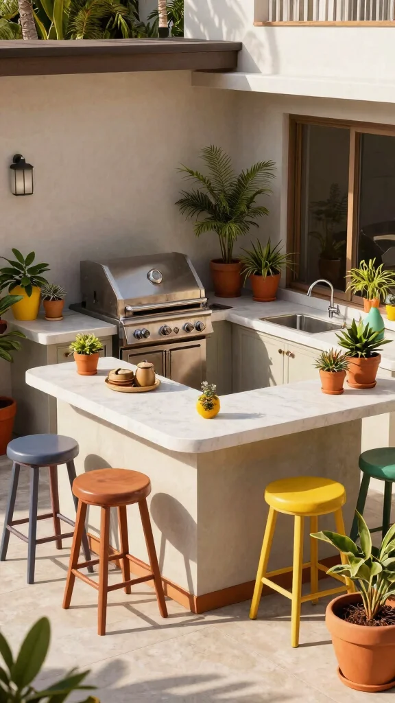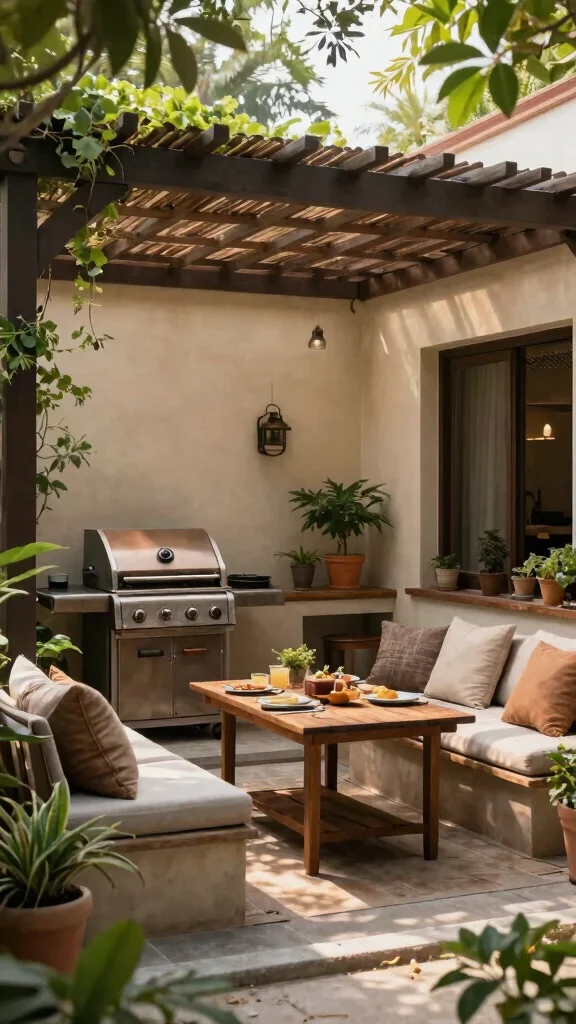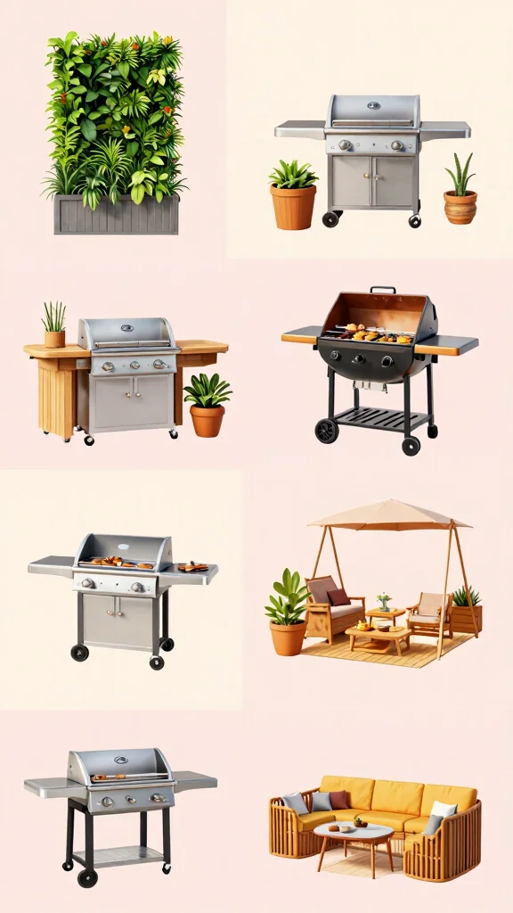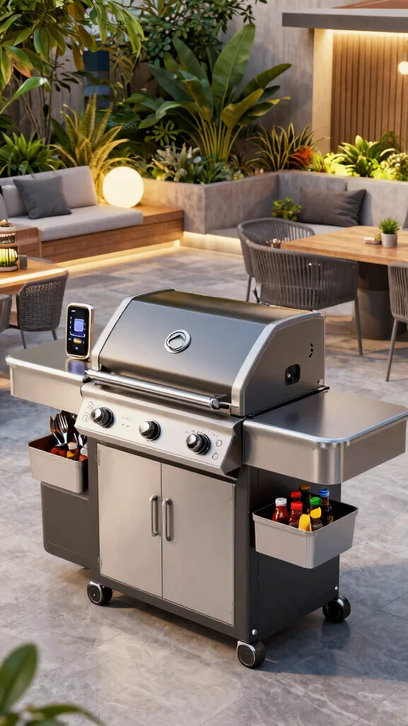 Add grill station ideas like a built-in unit or a compact rolling cart that tucks away when not in use.