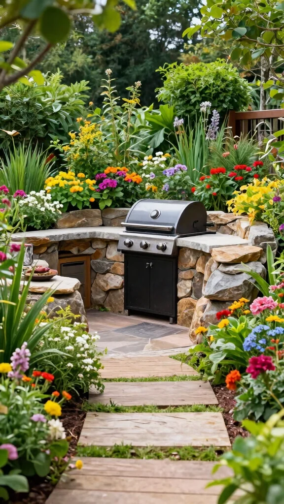 Imagine cooking amidst the beauty of your garden with a garden-integrated BBQ area. This design incorporates brick or stone pathways leading to the grill, surrounded by blooming flowers and lush greenery.