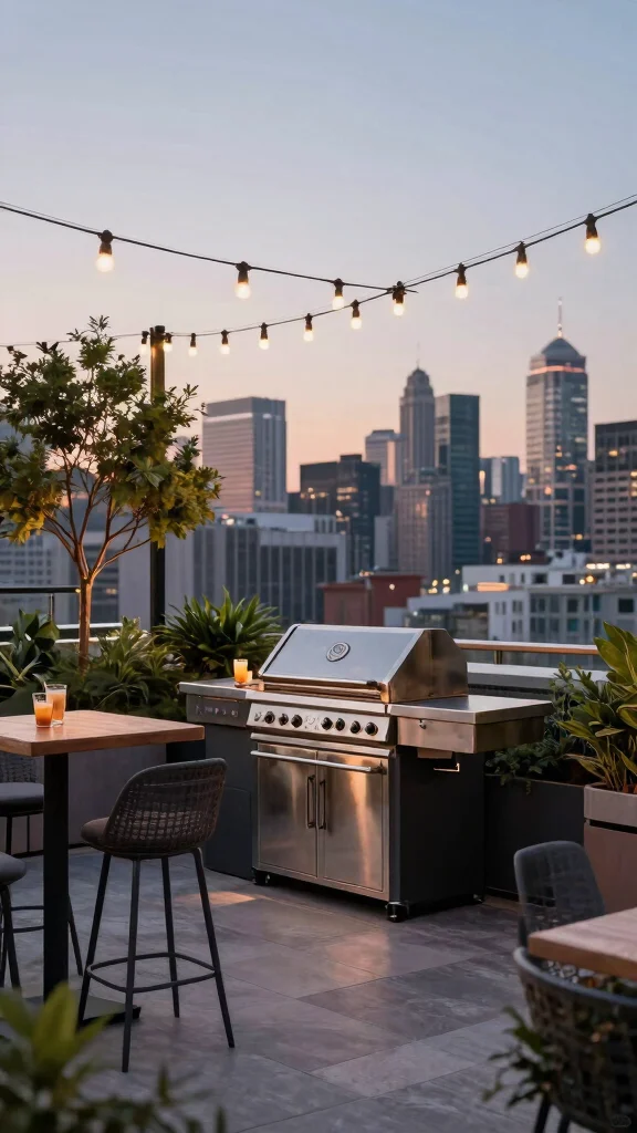 Transform your rooftop into a chic grilling oasis with compact grills and stylish furniture. This design is perfect for urban dwellers looking to enjoy beautiful views while cooking.