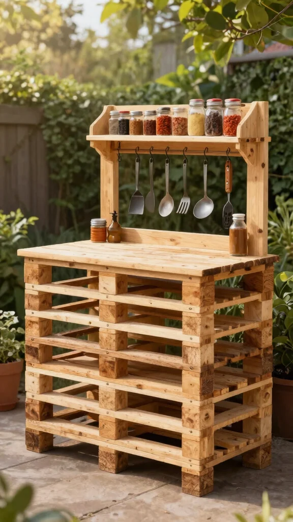 Begin by sanding the pallets to avoid any splinters. Stack two pallets for added height and secure them together. A weatherproof coat will help them endure the elements. Attach hooks on the sides to keep your grilling tools handy.