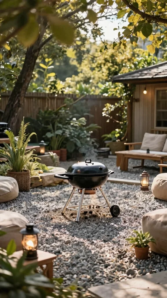 Place a portable grill and a few seating options on the gravel. Enhance the space with decorative elements like lanterns and small plants.