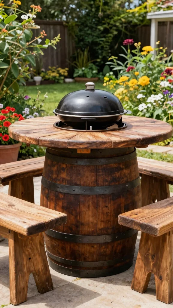 Upcycling is trendy and a fantastic way to create a unique BBQ table. Transform old wine barrels into the base for your grilling station. They provide an interesting design element while offering ample storage for BBQ essentials.