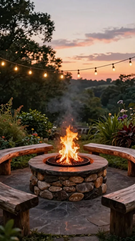Build a circular fire pit and top it with a grill grate. Surround the area with benches or logs for a rustic seating arrangement.
