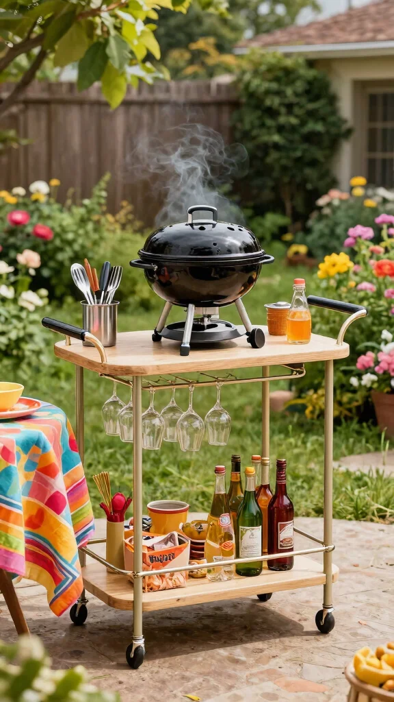 This fun bar cart BBQ setup encourages socializing while you cook, making it an ideal centerpiece for any outdoor event.