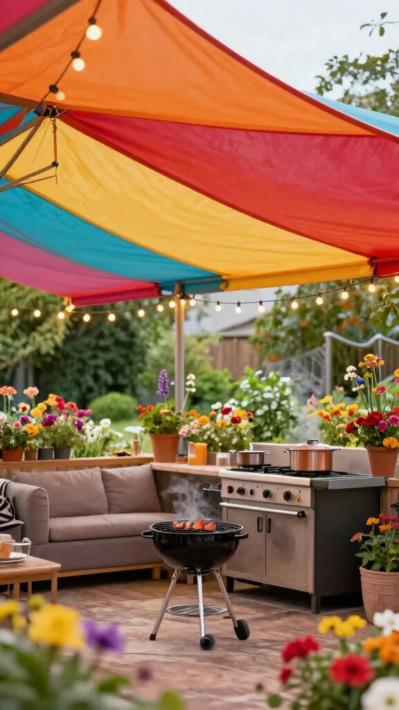 A colorful outdoor cooking canopy not only shields from the sun but adds a lively element to your cooking area.