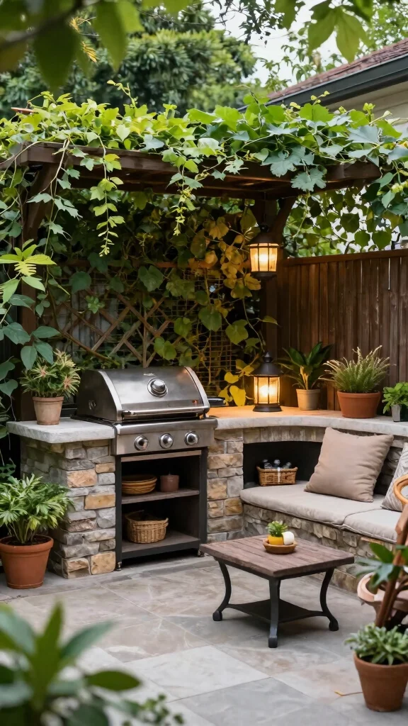 Enjoy the comfort of a built-in grill nestled in a sturdy stone surround. The trellis filled with climbing plants offers natural privacy, while compact seating ensures comfort without clutter.