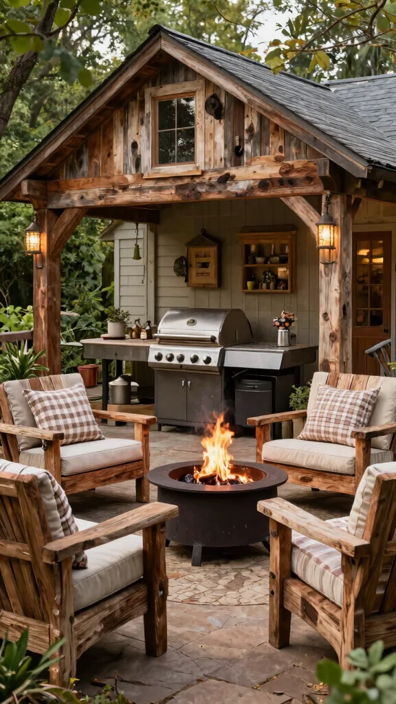 Imagine reclaimed wood for the grill station and furniture, vintage accents like old lanterns, and ample space for cooking and socializing.