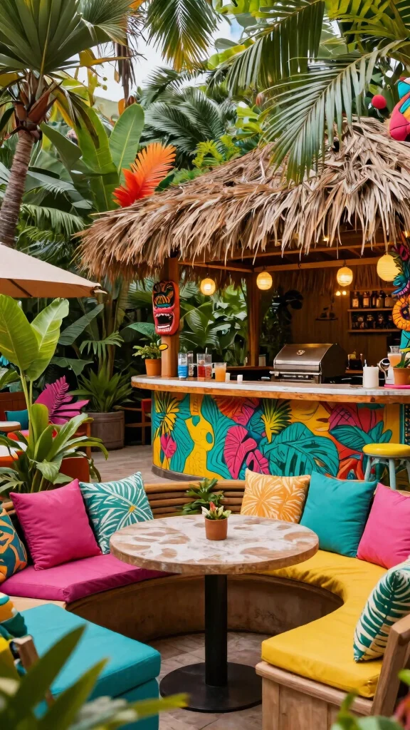 Enjoy brightly colored furniture and decor, lush tropical plants like palms and hibiscus, and a tiki bar setup for drinks and snacks.