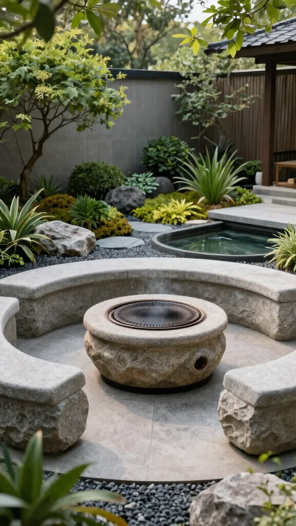 Enjoy a minimalist design featuring natural stone elements, a soothing water feature, and comfortable seating for relaxation.