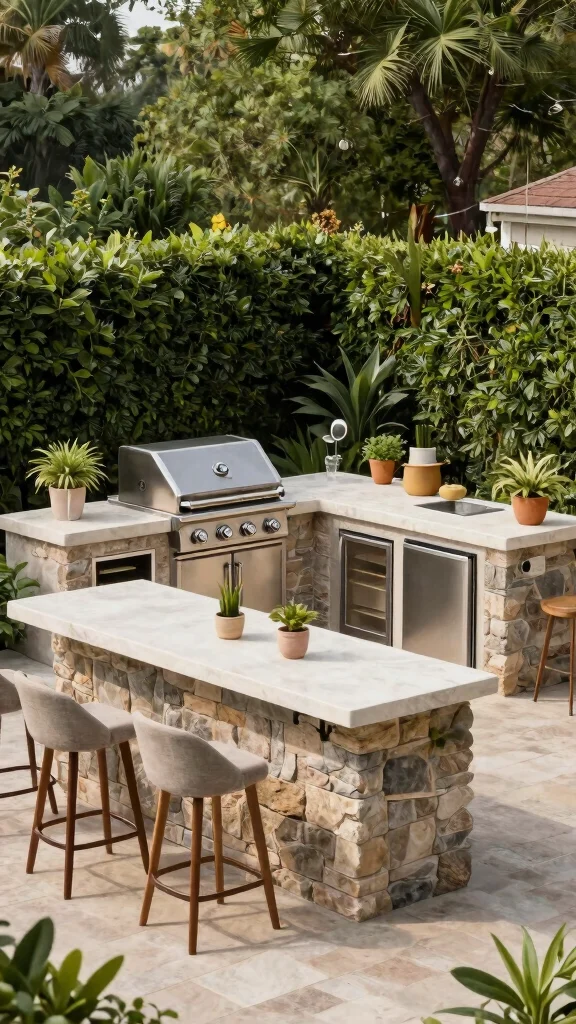 A built-in grill seamlessly integrates into a stylish stone island, complete with a bar top for serving drinks. You’ll also find ample storage for all your grilling tools, keeping everything organized and at your fingertips.