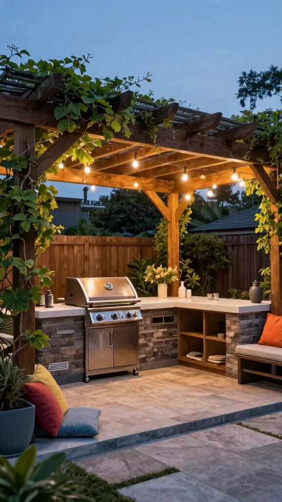 Create a spacious grilling station complete with countertop space for food prep. The pergola can be adorned with climbing plants, offering natural shade and beauty, while a cozy seating area invites guests to relax.