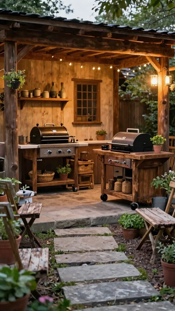 Picture a rustic wooden grill cart, natural stone pathways leading the way, and comfortable weathered furniture.