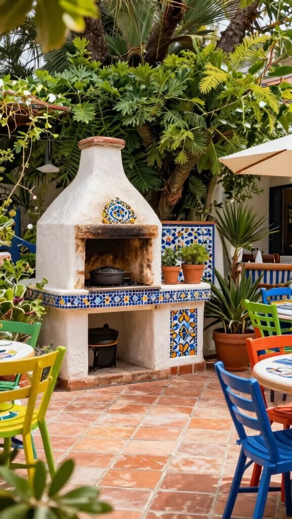 Escape to the Mediterranean with a grill area bursting with vibrant colors and lush greenery. This design often features terracotta or mosaic tiles, adding a distinct flair to your outdoor cooking space.