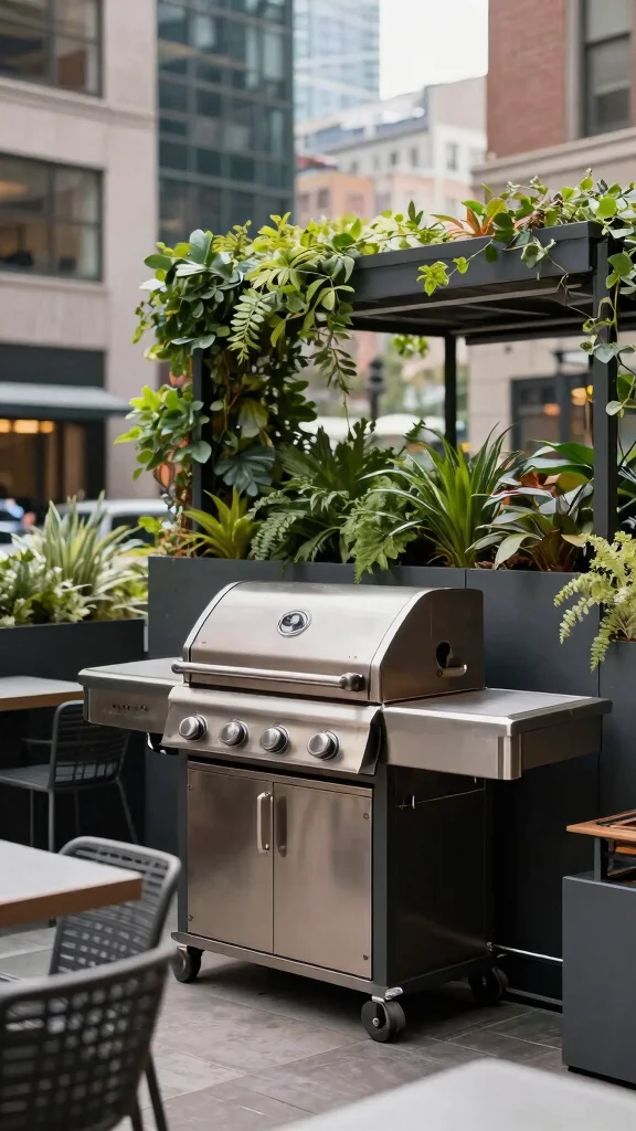 Featuring a compact grill with a stylish finish, space-saving furniture, and vertical gardening options, this setup is perfect for city dwellers.