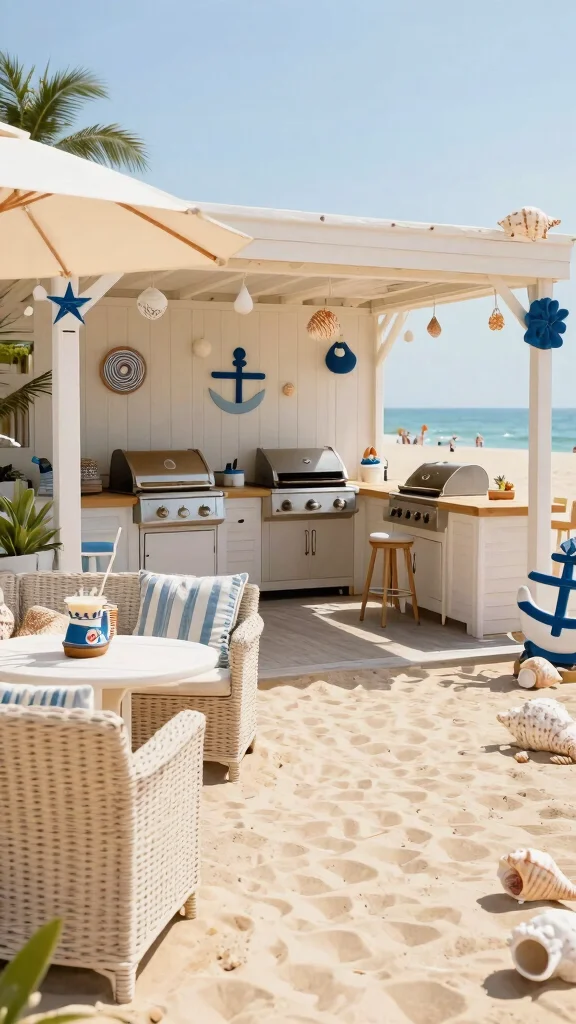 Use ocean-inspired colors like blues and whites to enhance the beachy feel, and consider creating a sandy path leading to the grill area for that extra coastal charm. This design makes every cookout feel like a vacation, perfect for summer parties or sunny afternoons.