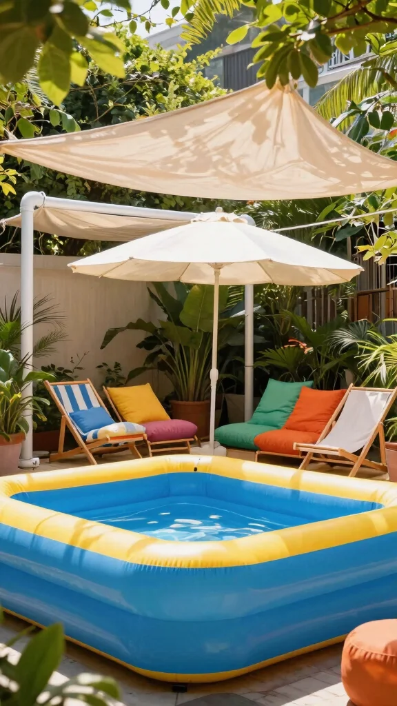Consider using a beach umbrella for easy setup or creating a DIY canopy with fabric and PVC pipes. Comfortable seating underneath shade structures invites relaxation, letting everyone enjoy the pool without the worry of sunburn.