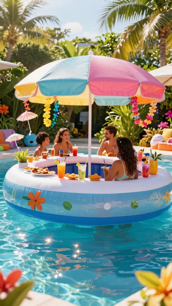 Fill the bar with drinks, snacks, and even sunscreen for convenience. Use inflatable coolers to keep drinks cold and decorate the bar with tropical-themed items for that beachy vibe.