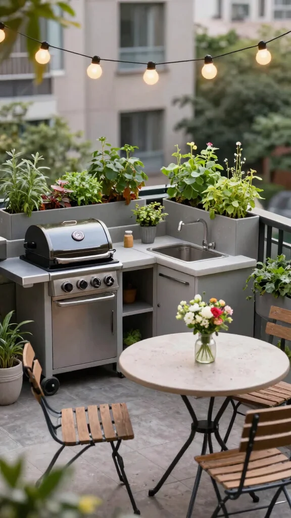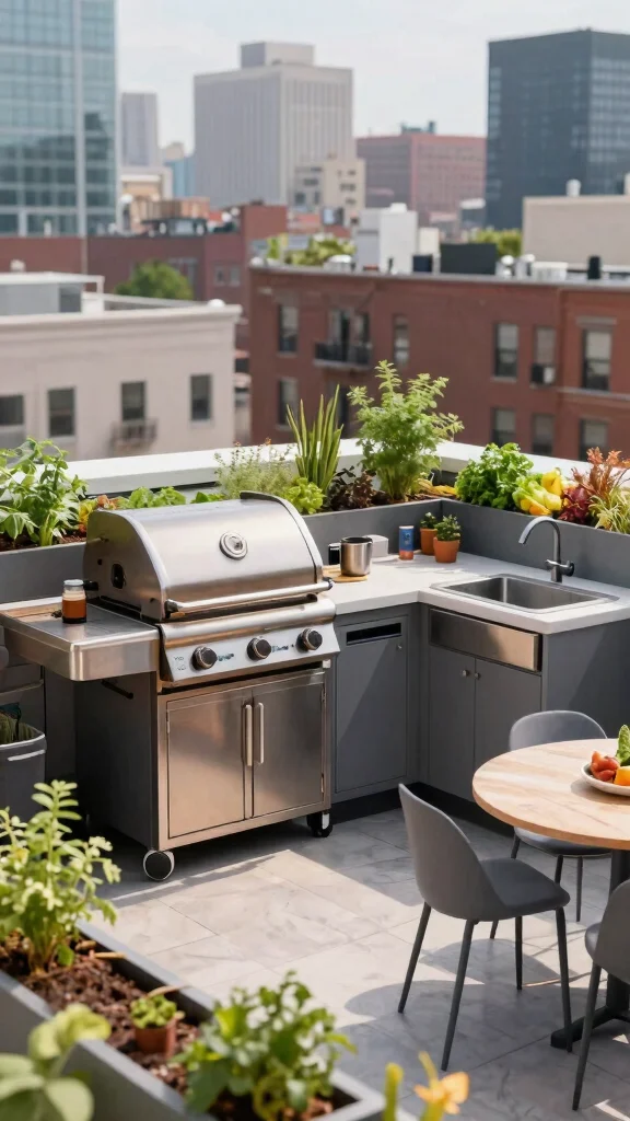 Fun fact: Urban rooftops can add up to 50% more entertaining space with a compact mini outdoor kitchen. Start with a weather-ready grill, a small sink, and planter boxes to harvest herbs while you cook.