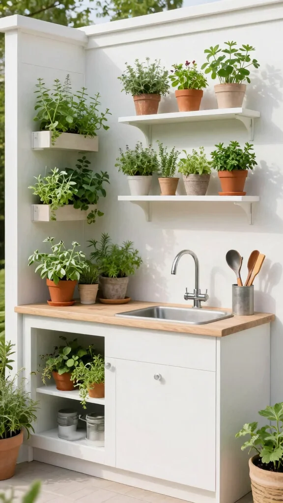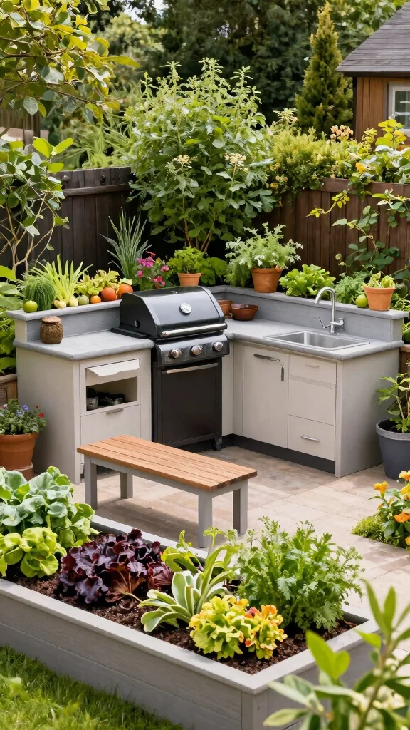 Use wall-mounted shelves and peg rails, weatherproof cabinets, and a compact rolling cart to keep essentials close at hand. Choose a bench-height prep table with integrated storage, and use pull-out drawers for spices and tools. Incorporate a dedicated outdoor cooking ideas setup with a small grill or induction cooktop on a cart, plus a compact fridge if power allows. For small space gardening, integrate a herb rail and vertical planters above the prep area so you grow fresh herbs right where you cook. If possible, choose a fold-down counter to extend prep space when you need it and tuck away when you don’t. Finally, consider a small trash/recycling solution and hidden waste bin to keep the area tidy.