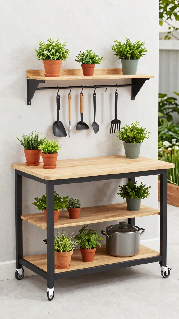 Opt for a sturdy table that doubles as a food prep space while giving you room for potting plants. This setup keeps everything efficient without sacrificing style.