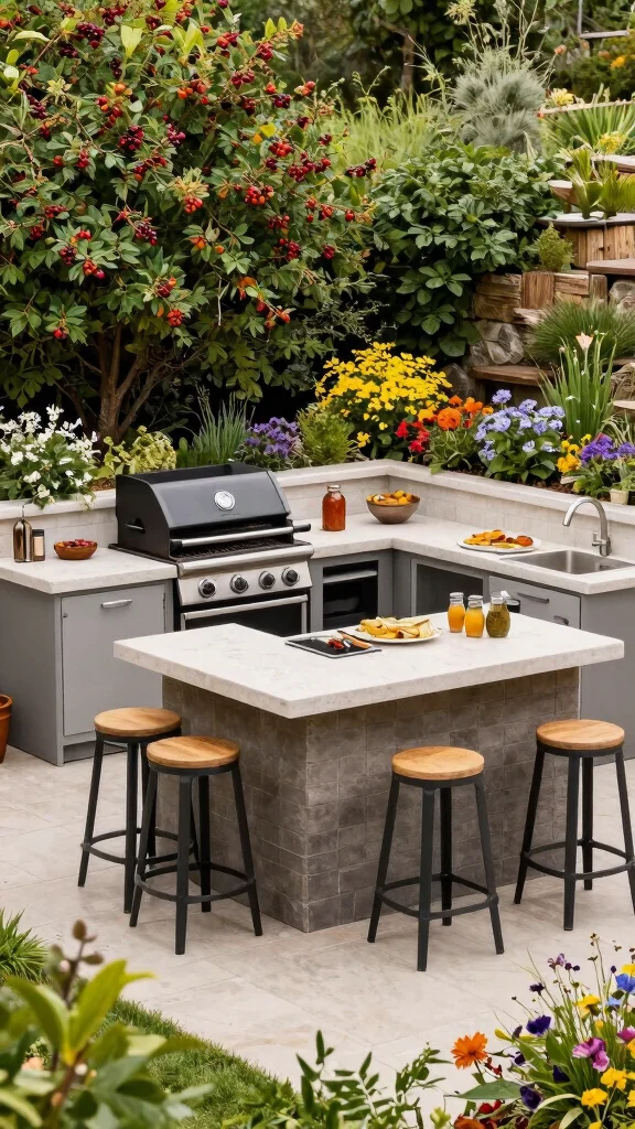 Adding a few barstools creates a casual vibe, making it ideal for entertaining friends while surrounded by edible landscaping, like berry bushes or flowering plants.