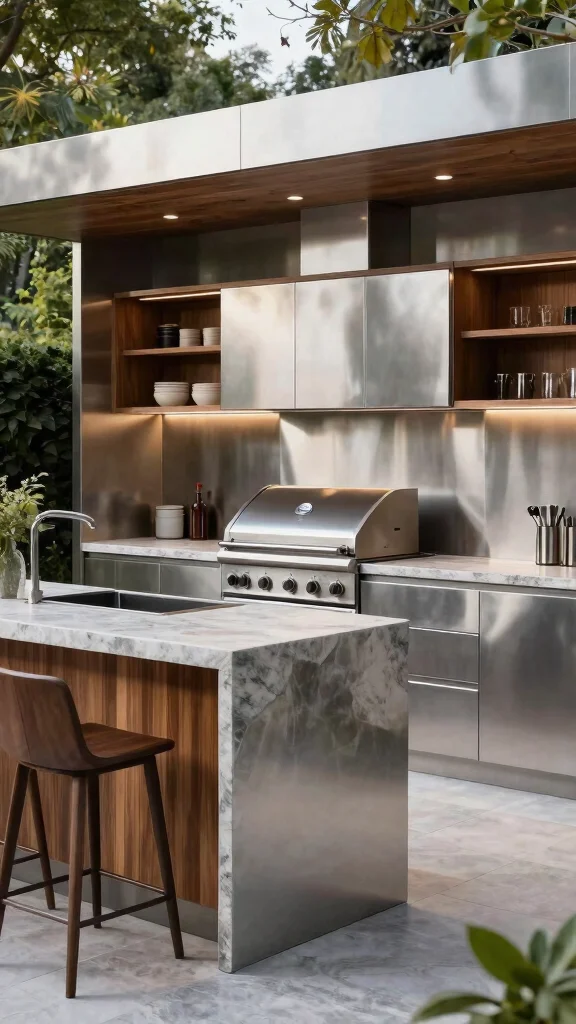 Stylish outdoor sinks can also integrate water into your kitchen, adding both function and freshness. Choose contemporary designs that fit within the minimalist theme for a cohesive look.