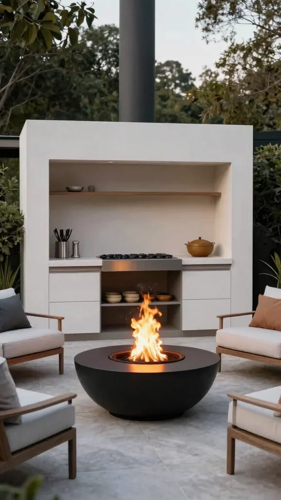 Looking to enjoy your outdoor kitchen even in cooler weather? Fire elements can extend your cooking experience into the evening. A modern fire pit or built-in fireplace can create a warm, inviting atmosphere for gatherings, making outdoor cooking a year-round pleasure.