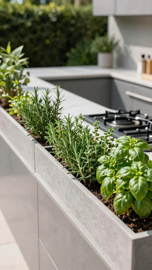 Want to bring a touch of nature to your outdoor kitchen? Built-in planters are the perfect solution, allowing you to keep fresh herbs and vegetables right at your fingertips. Envision snipping basil for your favorite dish or picking ripe tomatoes, making cooking a delightful experience.