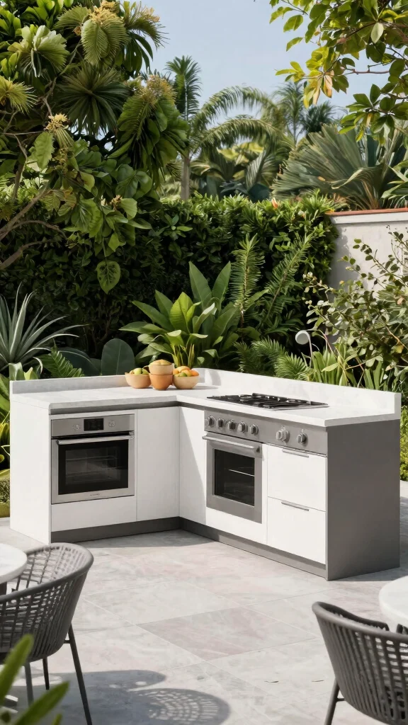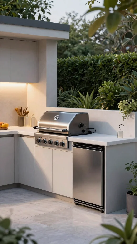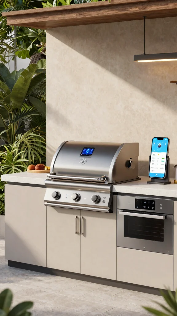 Imagine a portable grill or sleek outdoor refrigerator positioned for easy access, enhancing your culinary creativity. Smart technology, like app-controlled grills, adds convenience, making your kitchen functional and modern.
