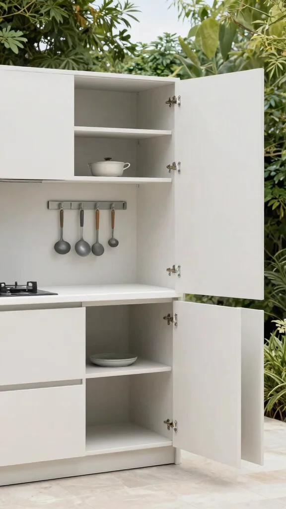 Tired of clutter in your outdoor kitchen? Embrace minimalist storage solutions that keep everything organized while looking sleek. Hidden cabinets or drawers can blend seamlessly into the design, while open shelving allows you to display essentials without overwhelming the space.