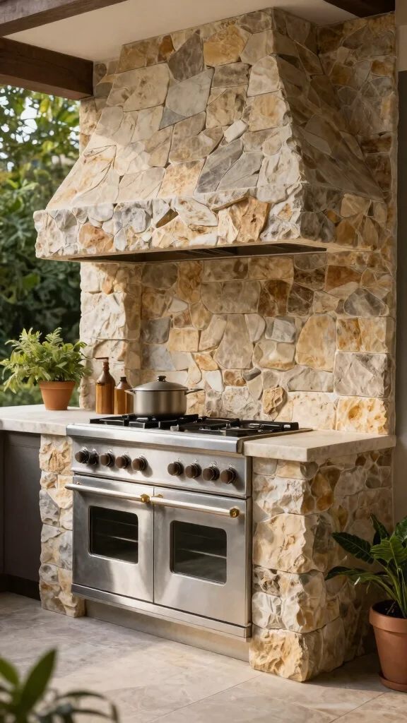 Want to add warmth to your modern outdoor kitchen? Natural stone accents can offer just that while keeping a minimalist vibe. A striking stone backsplash or island creates a focal point that enhances your outdoor experience without overwhelming the design.