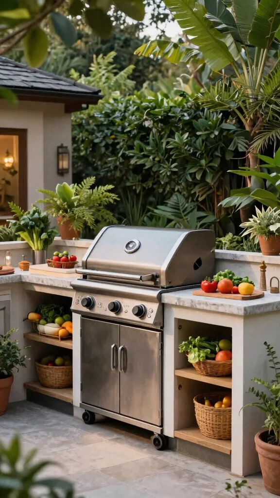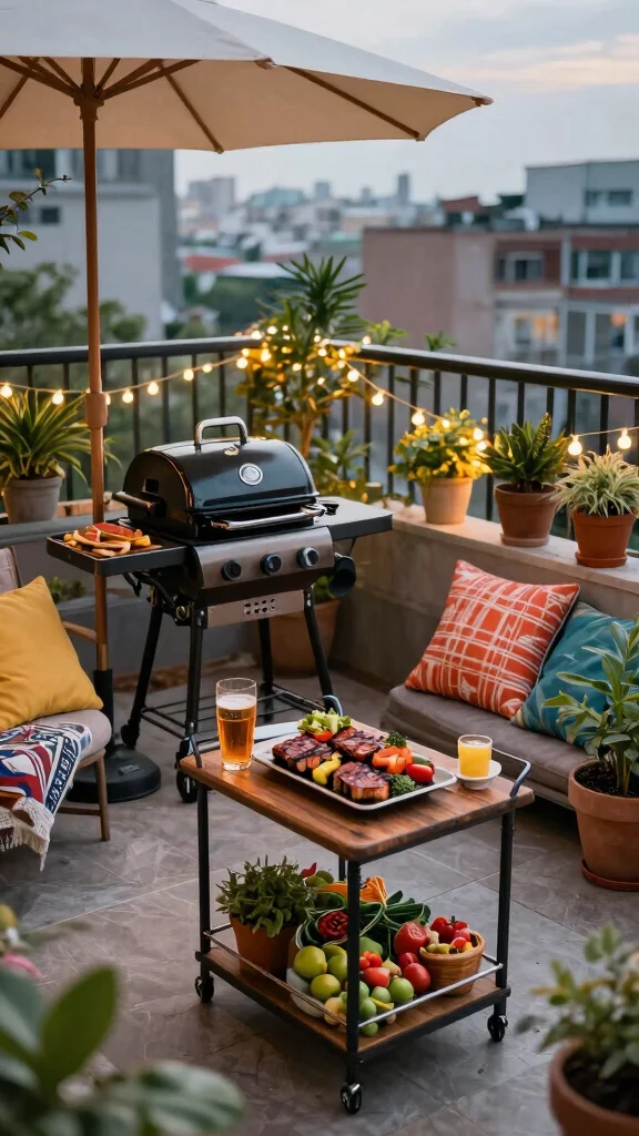 Choose a compact grill with built-in tools and a small cart that rolls away when not in use. Add a weatherproof prep counter, a wall-mounted shelf for spices and utensils, and foldable seating to save space.