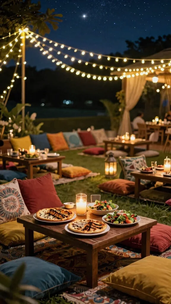 Transform your backyard into a magical dining space under the stars. With soft fairy lights and cozy seating, you can create an enchanting atmosphere for your guests. Lay out cushions and blankets to make it comfortable, while a portable grill allows you to cook right where everyone gathers.