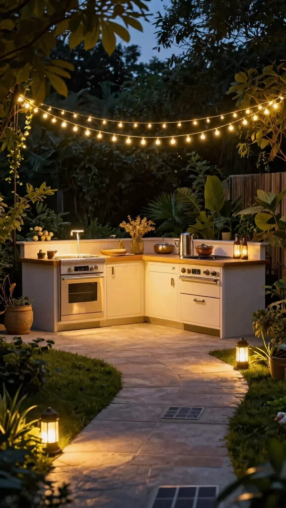 Planning to cook and dine outdoors in the evening? Lighting is essential for creating a warm and inviting atmosphere. Opting for eco-friendly lighting options like solar-powered lights or LED fixtures enhances your outdoor kitchen while being gentle on the environment.