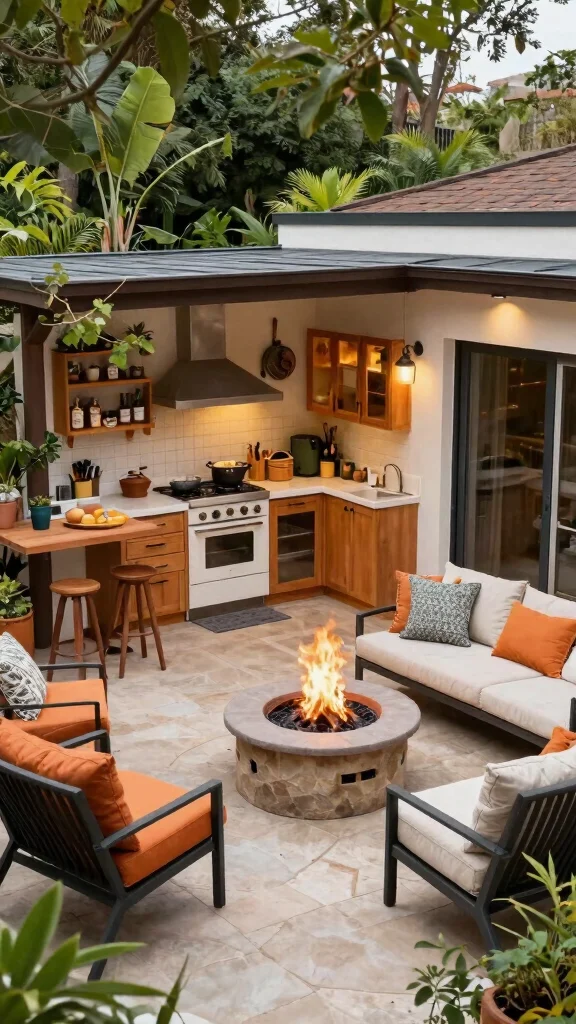 Use movable stools and stackable chairs to reconfigure for crowds, and add a small fire pit or heater for year-round use in a dedicated outdoor entertaining areas zone. Choose patio ideas like low-profile benches and integrated planters to blend seating with greenery, creating a cohesive garden design tips vibe.