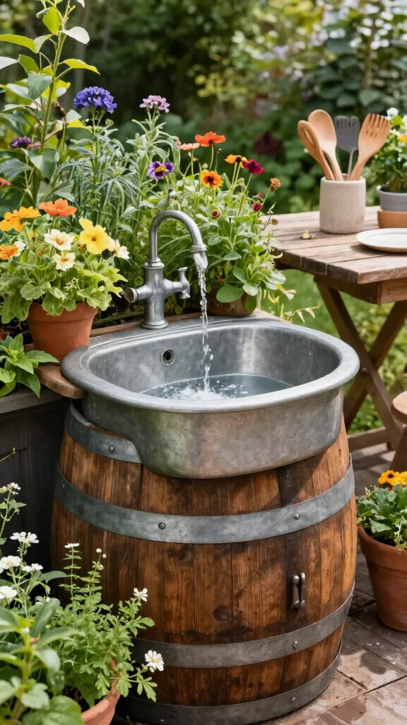 To implement this idea, simply cut the barrel in half and fit it with a basin. You can easily find barrels at local markets or online, and with minimal tools, you can set up this charming sink. This eco-friendly choice also promotes sustainability by repurposing old materials.