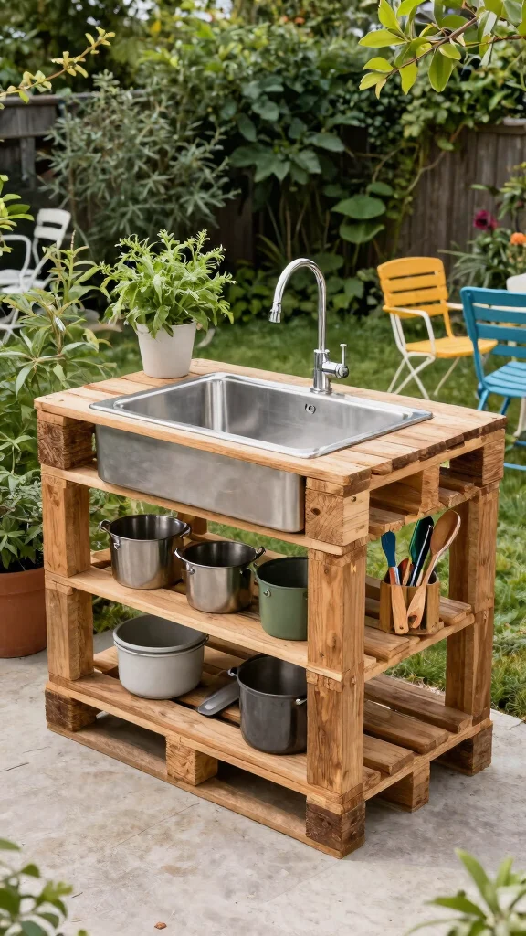 Use wooden pallets to create a functional and stylish sink station perfect for outdoor cooking.
