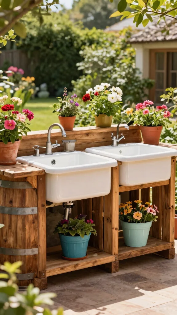 Using vintage barrels as garden sinks infuses your outdoor kitchen with a unique rustic charm. The natural wood grain and aged patina create a lovely focal point, perfect for washing veggies or cleaning up after a meal. This design beautifully merges functionality with aesthetic appeal, creating a warm and inviting atmosphere in your garden.