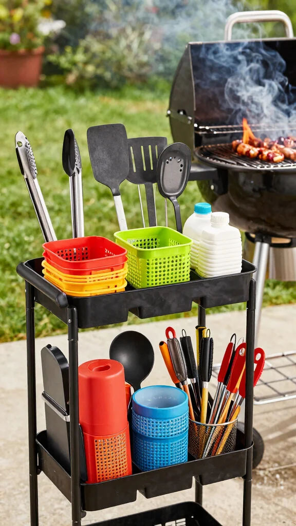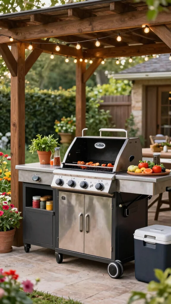 Add a portable island or grill cart for a dedicated grilling accessories station and keep utensils, spices, and fuel in weatherproof containers.